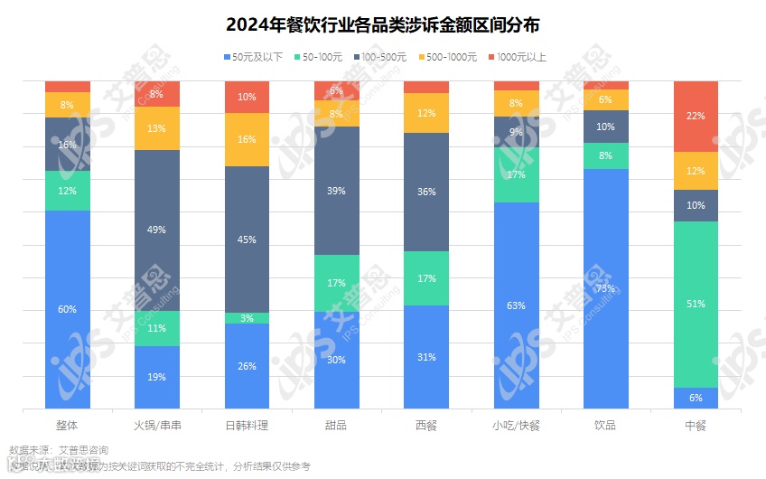 图8:2024年餐饮行业及各品类涉诉金额区间分布