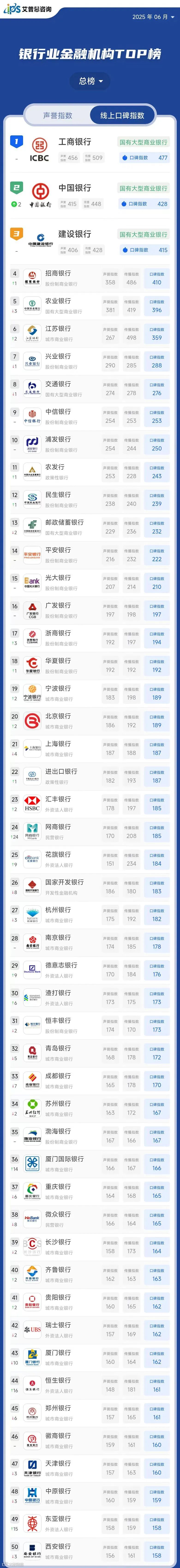6月线上口碑指数排名前三的银行业金融机构为:工商银行(国有大型商业银行,口碑指数477,排名与上月持平)、中国银行(国有大型商业银行,口碑指数428,排名较上月上升2位)、建设银行(国有大型商业银行,口碑指数415,排名与上月持平)。