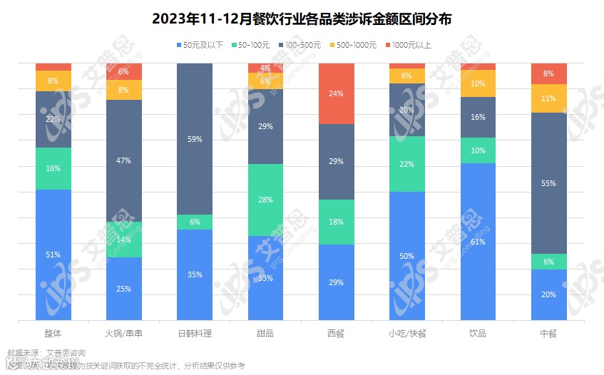 图7:2023年11-12月餐饮行业及各品类涉诉金额区间分布