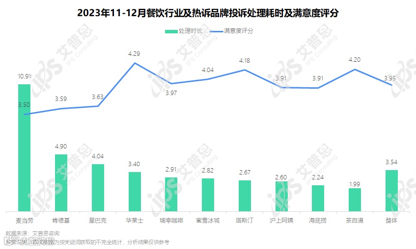 图9:2023年11-12月餐饮行业及热诉品牌投诉处理耗时及满意度评分