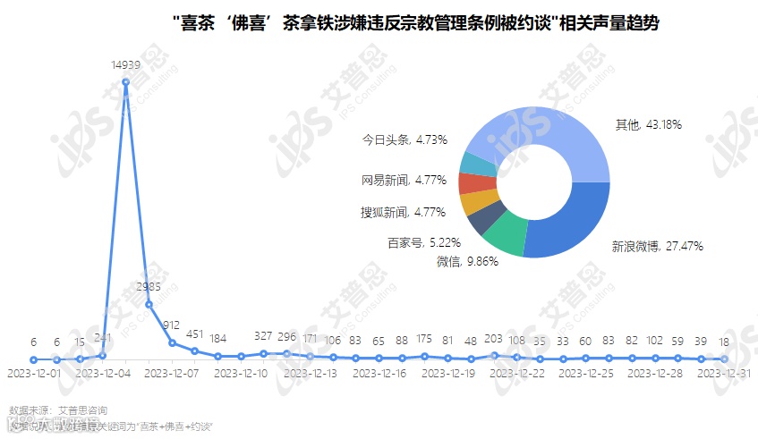 艾普思监测数据显示,2023 年12月,“‘佛喜’茶拿铁涉嫌违反宗教事务管理条例被约谈”相关声量共计2.22万,并于12月5日达到声量顶峰(1.45万条)。相关信息主要来自新浪微博(27.47%)、微信(9.86%)、百家号(5.22%)等站点,新浪微博上相关话题 #喜茶涉嫌违反宗教事务管理条例被约谈#共获4.5亿阅读量、26.6万互动量、1.8万讨论量。