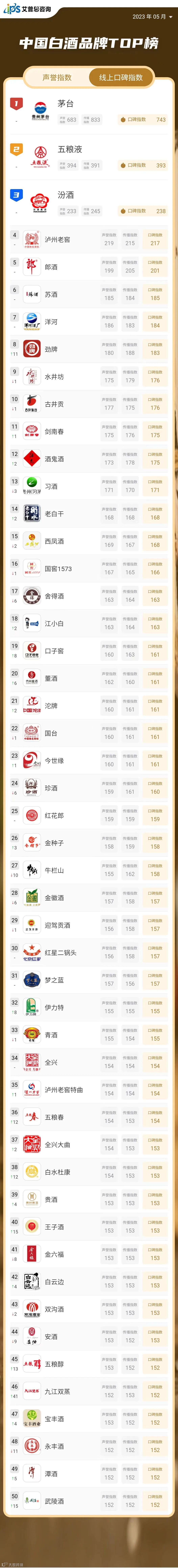 艾普思指数原创榜单《中国白酒品牌线上口碑指数排行榜》旨在依托互联网文本大数据分析技术,助力白酒企业把握品牌线上口碑表现,洞察消费者心理及需求,有针对性地实施品牌传播策略,优化品牌形象,促进品牌长远发展。