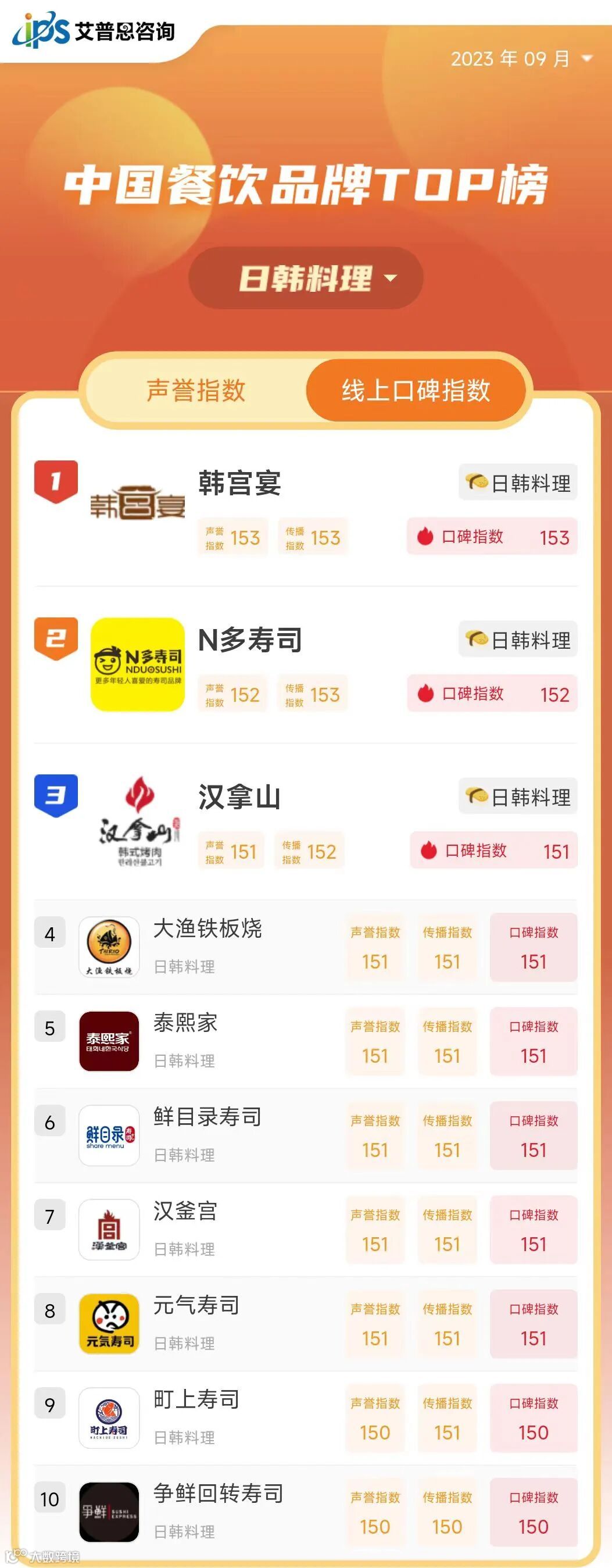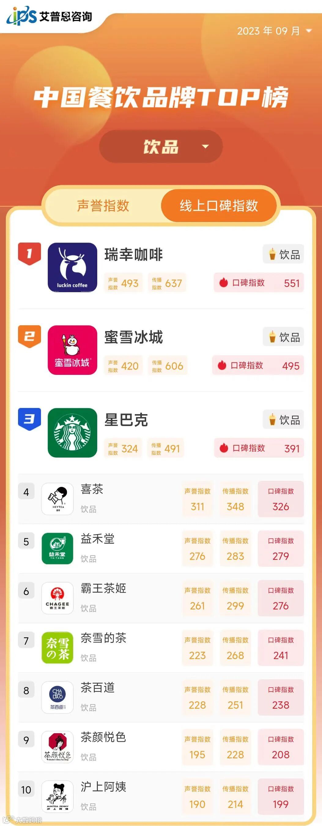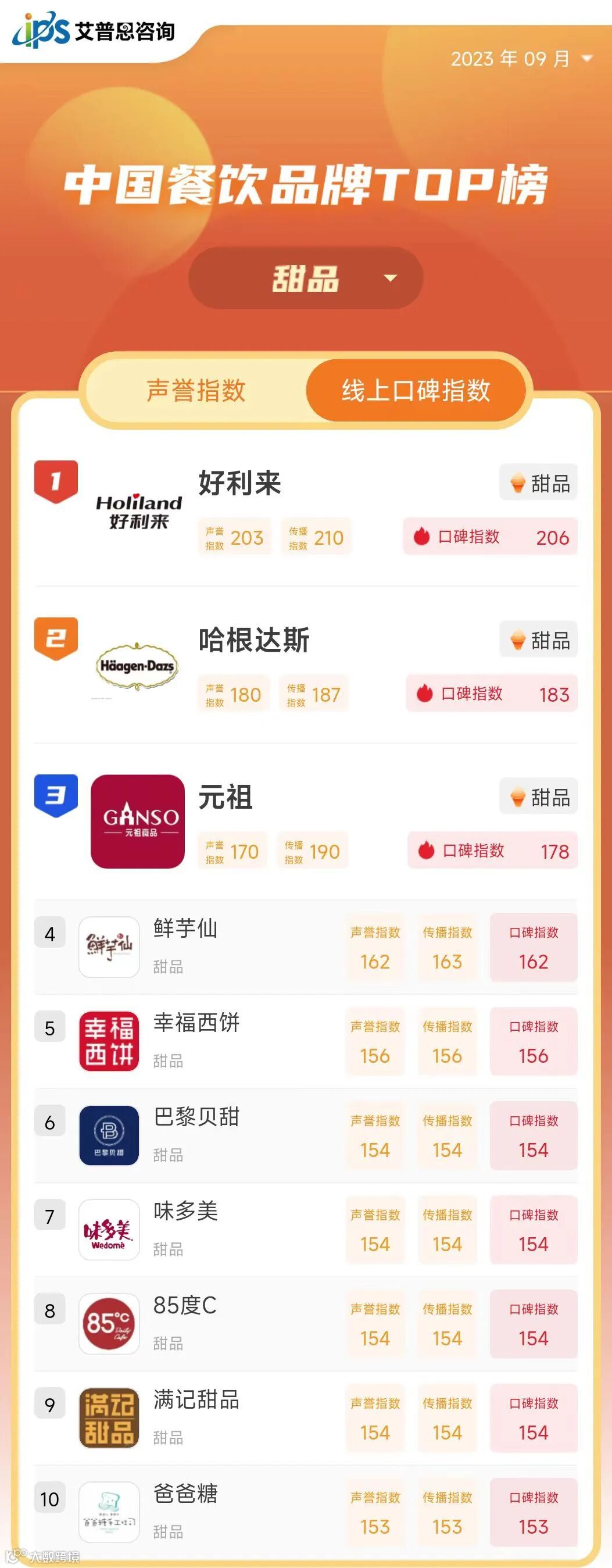 线上口碑指数排名前三的甜品品牌为:好利来、哈根达斯、元祖;线上口碑指数排名前三的饮品品牌为:瑞幸咖啡*、蜜雪冰城、星巴克;线上口碑指数排名前三的日韩料理品牌为韩宫宴、N多寿司、汉拿山*;线上口碑指数排名前三的西餐品牌为豪客来、gaga、王品牛排。