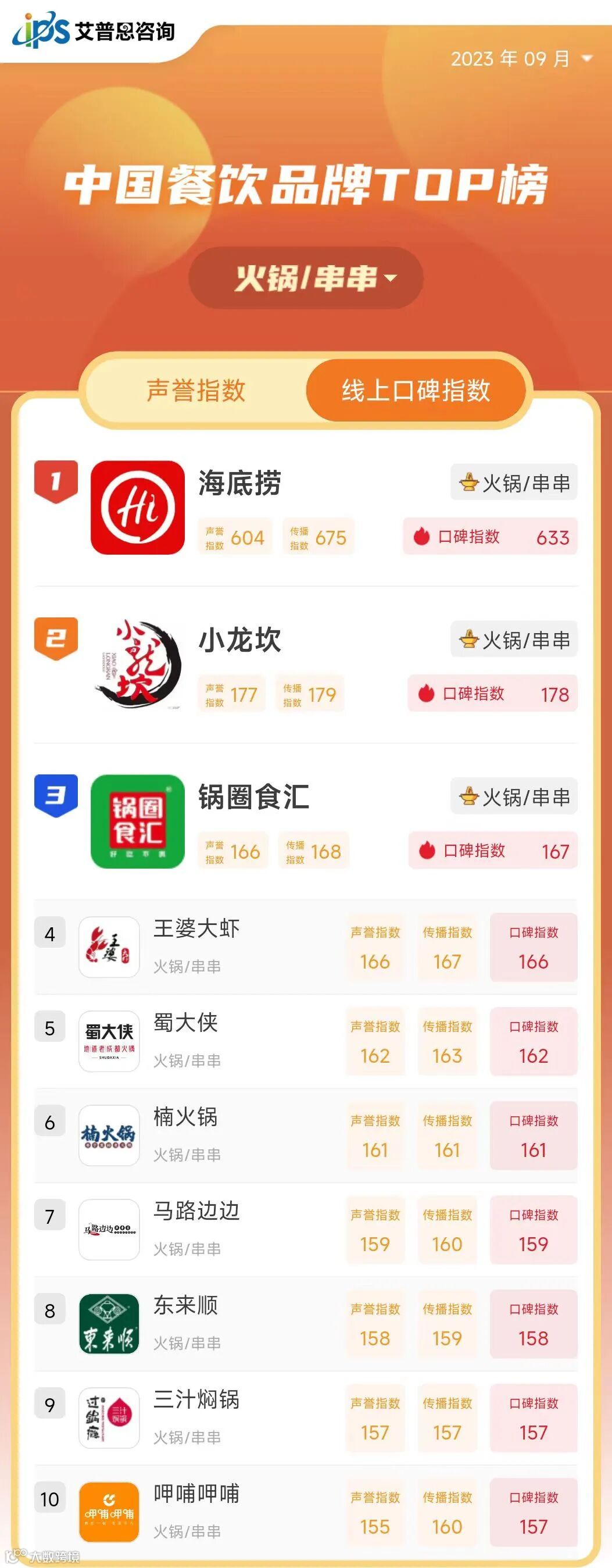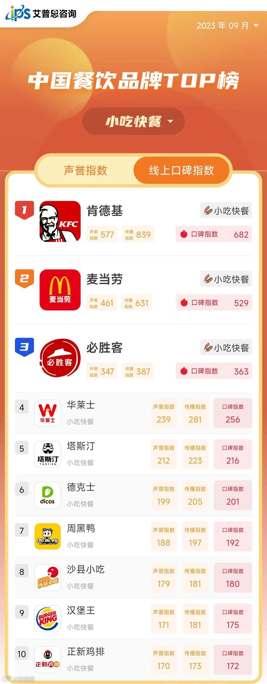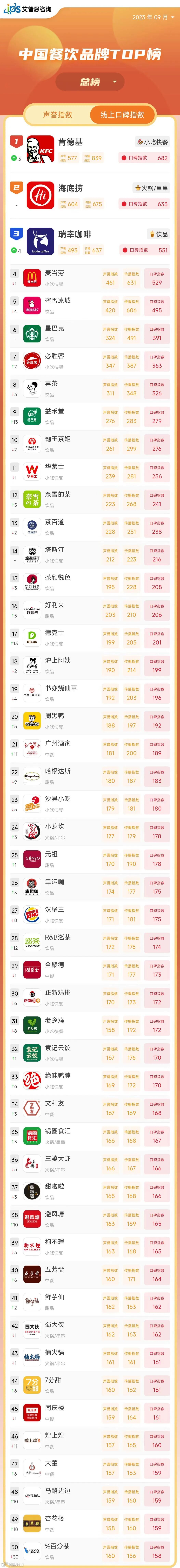 9月线上口碑指数排名前三的餐饮品牌为:肯德基(小吃快餐,口碑指数682,排名较上月上升3位)、海底捞(火锅/串串,口碑指数633,排名与上月持平)、瑞幸咖啡(饮品,口碑指数551,排名较上月上升2位)。