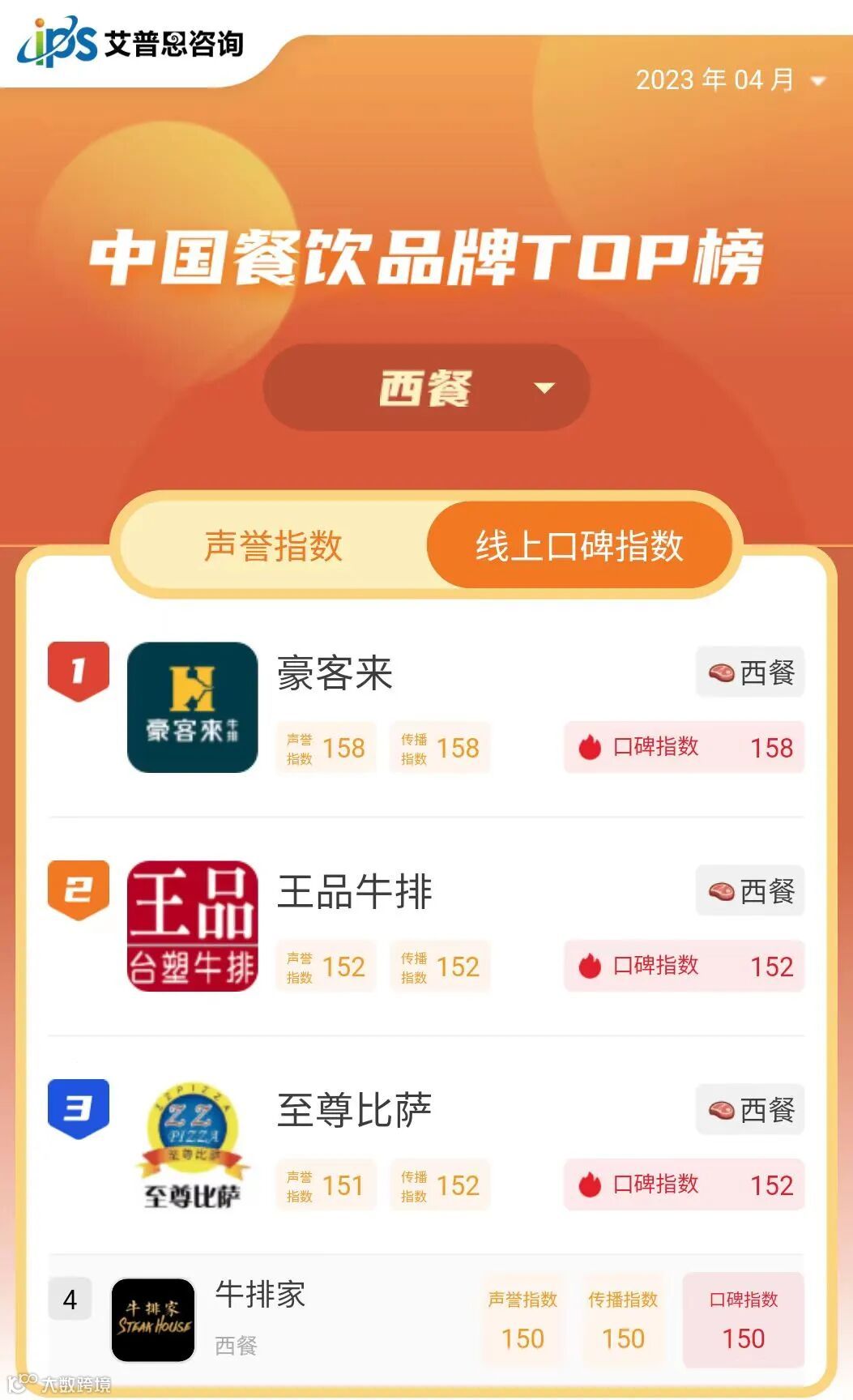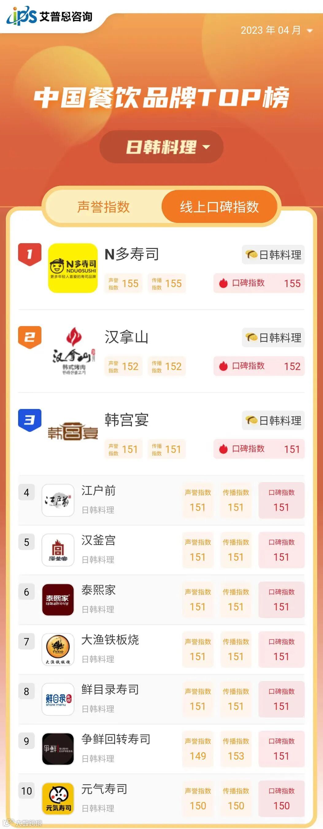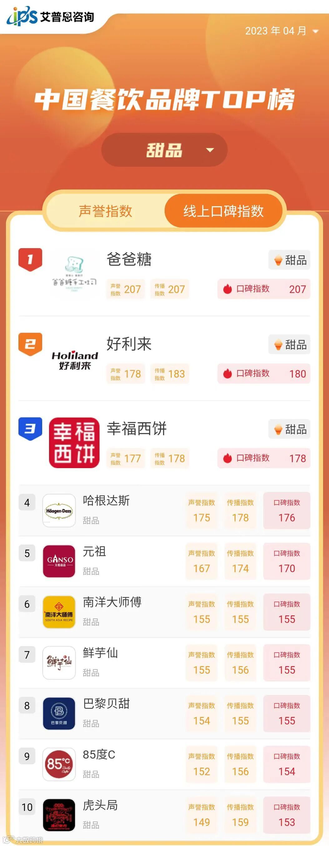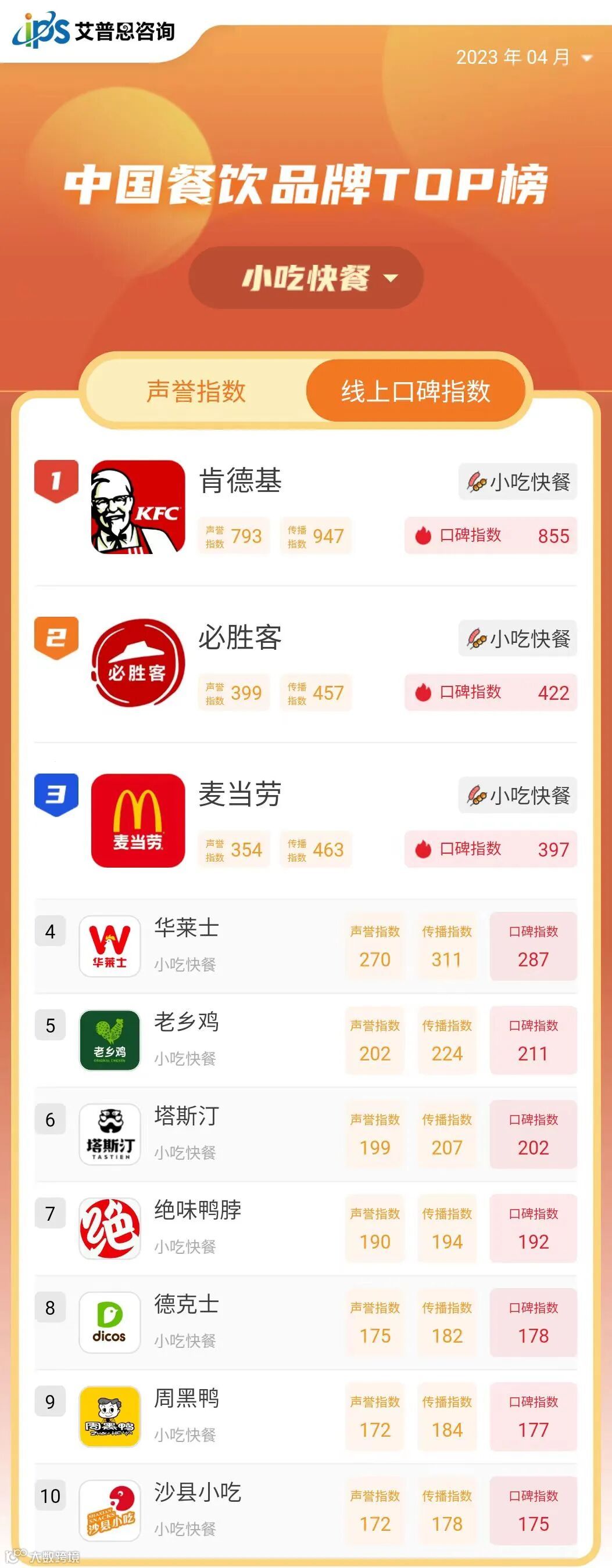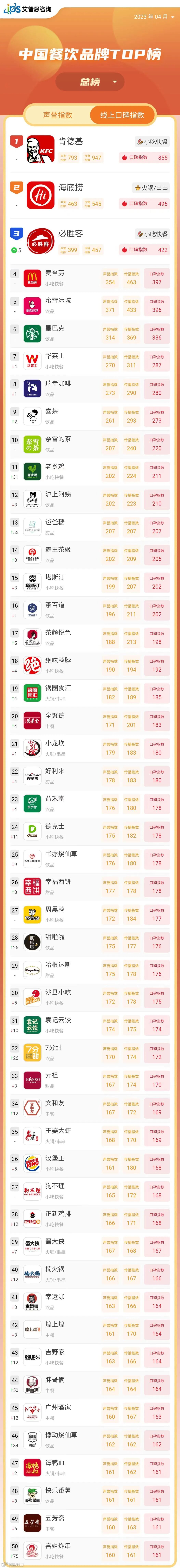 艾普思指数|2023年03月中国餐饮品牌线上口碑指数TOP50