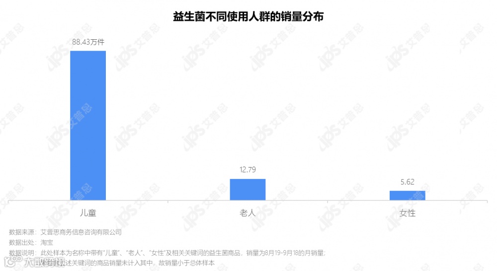 统计含不同使用人群关键词的益生菌商品销量发现,含“儿童”关键词的益生菌销量最高,达88.43万件,其次是老人(12.79万件)、女性(5.62万件)。