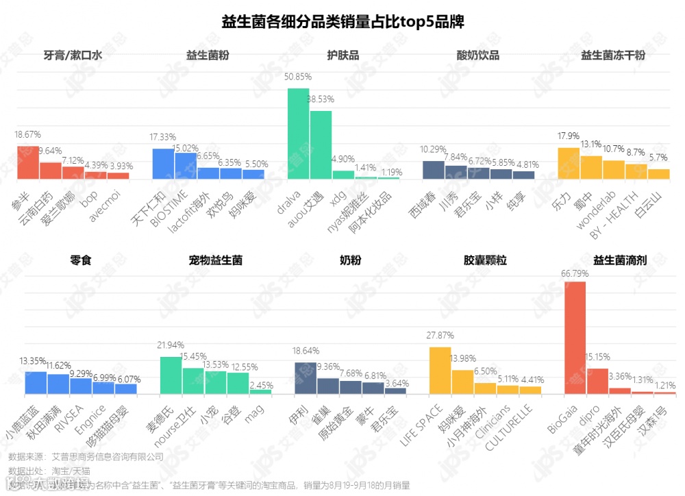 不含上述关键词的非宠物益生菌商品中,90%以上的销量集中在牙膏/漱口水、护肤品、酸奶饮品品类,这些商品基本是成人通用。