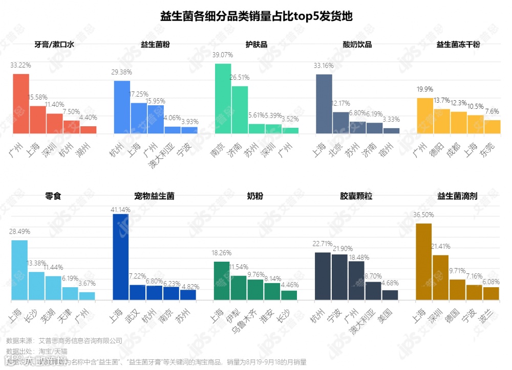 各品类中,益生菌滴剂的均价最高,为331.09元/件,其次是益生菌胶囊颗粒和益生菌奶粉,均价超过150元/件,均价低的益生菌品类销量明显高于均价高的品类。从细分品类发货地来看,益生菌滴剂、益生菌胶囊颗粒和益生菌粉(均价140.41元/件)的部分发货地在国外,是其均价较高的原因之一。