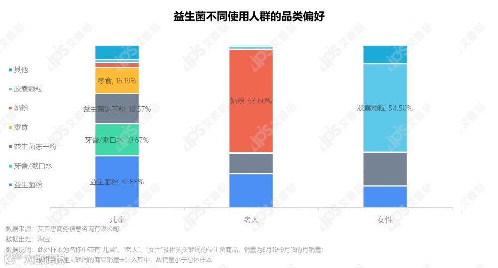 ◆儿童是益生菌的主要使用者,老人、女性分别偏爱益生菌奶粉和胶囊颗粒