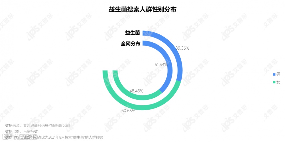 关注益生菌的人群主要集中在20-39岁之间,占比超过70%;其中20-29岁的人群占比37.58%,高出全网网民该年龄段人群占比约8个百分点;从性别来看,关注益生菌的女性占比为60.65%,高出全网网民女性占比约12个百分点;对产品关键词的分析结果(见报告第三部分)显示,女性搜索者中有相当比例是为未成年子女挑选、购买益生菌。