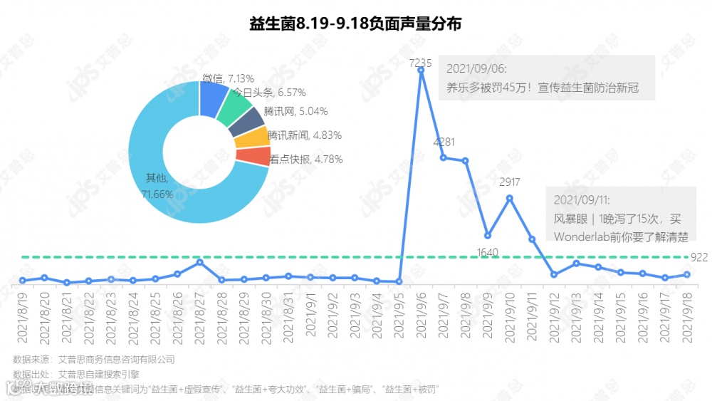 据艾普思自建搜索引擎抓取数据,2021年8月19日至2021年9月18日,益生菌的负面声量达2.8万余条;9月6日,“养乐多被罚45万!宣传益生菌防治新冠”事件爆出,被转发1.1万余次;9月11日,“Wonderlab益生菌导致腹泻不止”事件爆出,被转发297次;益生菌市场乱象频发,是行业规范和企业自律缺失的表现。
