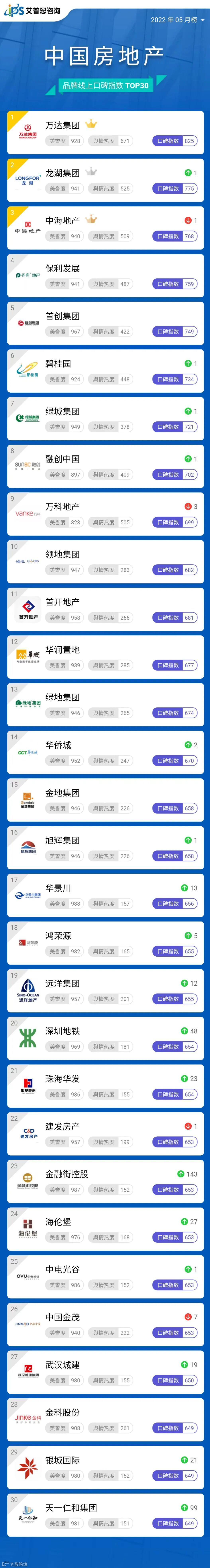 榜单|2022年05月中国房地产企业百度搜索SEO表现TOP30