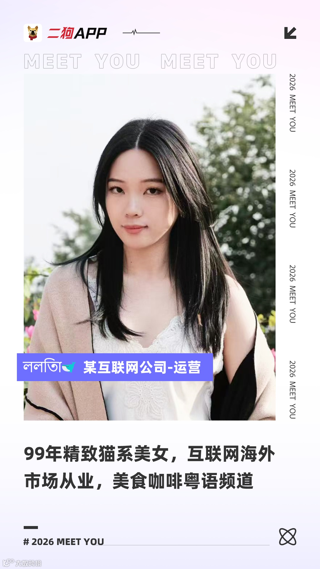 26岁广州女生,161cm/50kg。粤语母语,小语种专业背景,工作中常用国语和英语。
