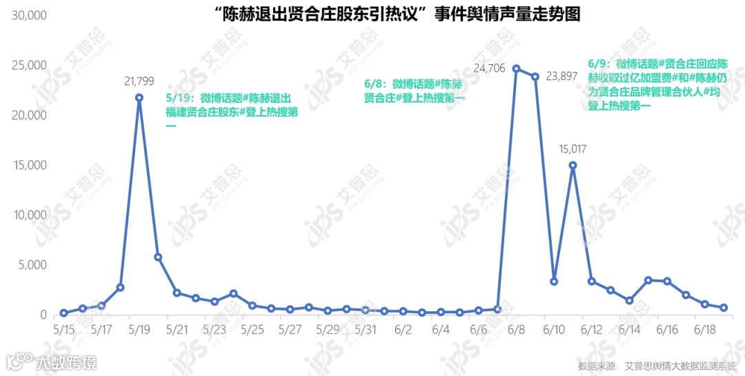 艾普思舆情大数据监测系统显示,“陈赫退出贤合庄股东引热议”事件舆情声量为131,410篇次,声量峰值出现在6月8日-6月9日(声量共计48,603篇次),自6月18日起,事件关注度开始下降。