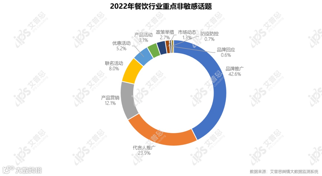基于艾普思舆情大数据监测系统,我们选取了2022年餐饮行业曝光量最高的话题进行综合分析。分析显示,在非敏感舆情话题中,涉及各品牌的话题占比较高,如肯德基、麦当劳、海底捞等,话题类型包括品牌推广、代言人推广、产品营销、联名活动等。