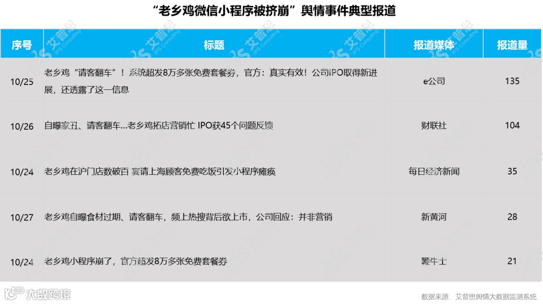关于“老乡鸡微信小程序被挤崩”舆情事件的典型报道包括《老乡鸡“请客翻车”!系统超发8万多张免费套餐券,官方:真实有效!公司IPO取得新进展,还透露了这一信息》《自曝家丑、请客翻车…老乡鸡拓店营销忙IPO获45个问题反馈》等,报道量排名前五的信息为: