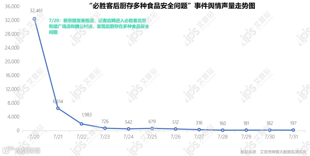 艾普思舆情大数据监测系统显示,“必胜客后厨存多种食品安全问题”事件舆情声量为44,453篇次,声量峰值出现在7月20日(单日声量32,461篇次),随后逐渐回落,7月24日降至500篇次以下。