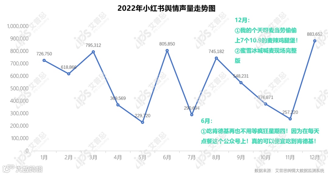从声量走势来看,12月,小红书餐饮行业舆情出现首次声量高峰(单月声量883,652篇次),主要由“我的个天呀麦当劳偷偷上7个10.9的麦辣鸡腿堡!”及“蜜雪冰城喊麦现场完整版”相关报道带动声量。