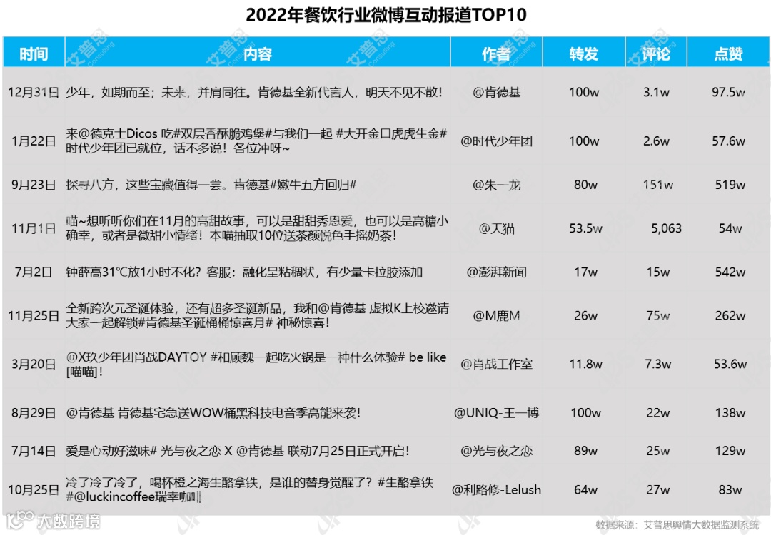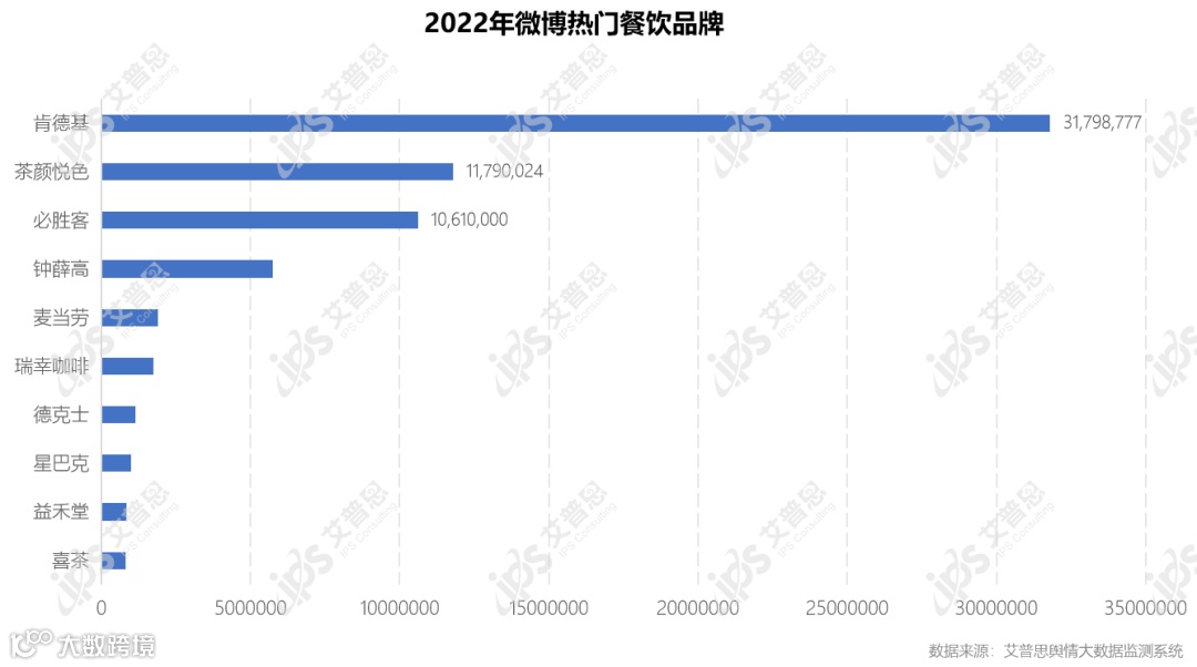 2022年,微博热门餐饮品牌排名前三的为肯德基、茶颜悦色、必胜客。