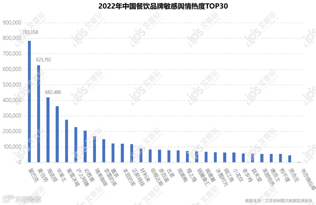 艾普思舆情大数据监测系统显示,2022年,敏感舆情热度排名第一的餐饮品牌为星巴克,敏感舆情声量达783,058篇次;其次为麦当劳,敏感舆情声量达625,192篇次;敏感舆情热度排名第三的为海底捞,敏感舆情声量达419,661篇次。2022年敏感舆情热度排名前30的餐饮品牌如下:
