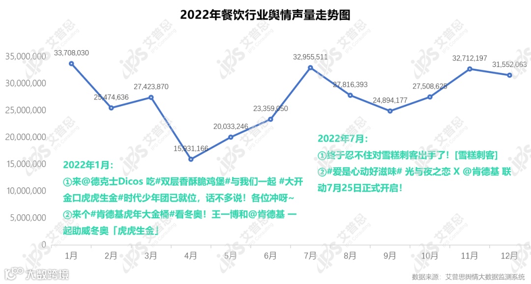 艾普思舆情大数据监测系统显示,2022年涉及餐饮行业的舆情声量为323,368,964篇次,月均声量达26,947,413篇次。从声量走势来看,2022年餐饮行业舆情声量峰值为7月,主要由话题“终于忍不住对雪糕刺客出手了!” 及“#爱是心动好滋味# 光与夜之恋 X @肯德基 联动7月25日正式开启!”带动声量。