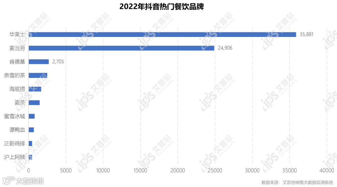 2022年,抖音热门餐饮品牌排名前三的为华莱士、麦当劳、肯德基。
