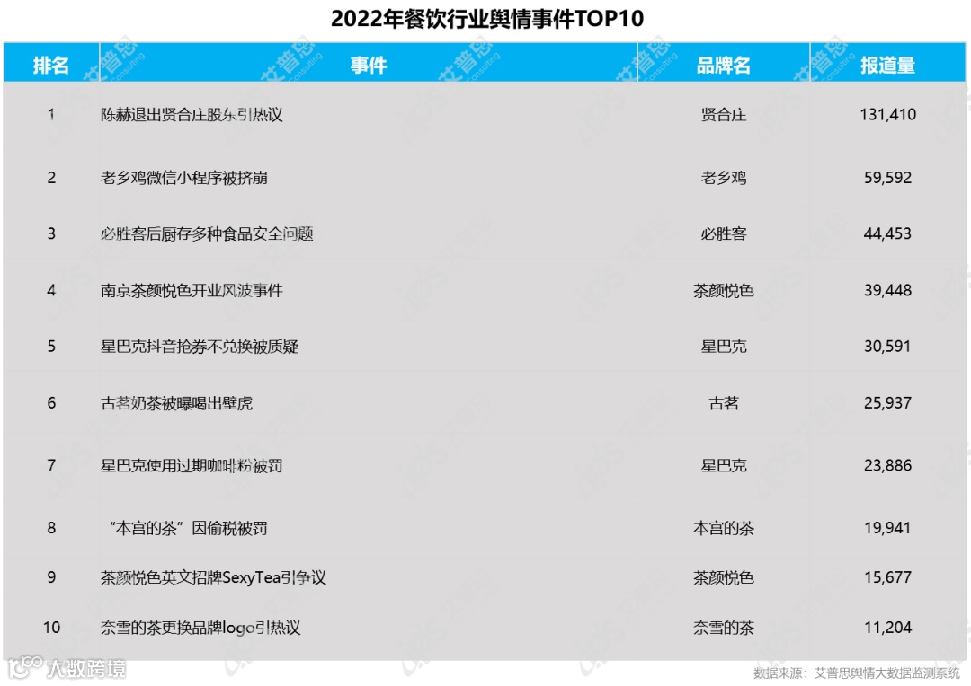 艾普思舆情大数据监测系统显示,2022年热度排名前十的餐饮行业舆情事件包括:“陈赫退出贤合庄股东引热议”、“老乡鸡微信小程序被挤崩”及“必胜客后厨存多种食品安全问题”等,涉及贤合庄、老乡鸡、必胜客等品牌。