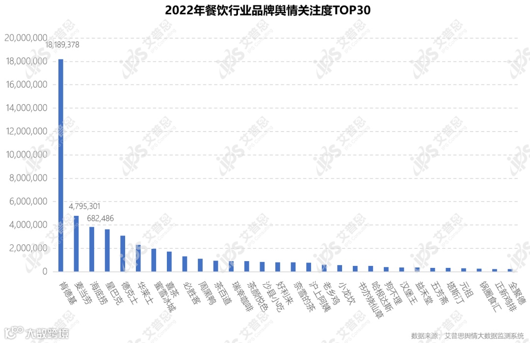艾普思舆情大数据监测系统显示,2022年,舆情关注度排名第一的餐饮品牌为肯德基,舆情声量达18,189,378篇次;其次为麦当劳,舆情声量达4,795,301篇次;关注度排名第三的为海底捞,舆情声量达3,843,837篇次。