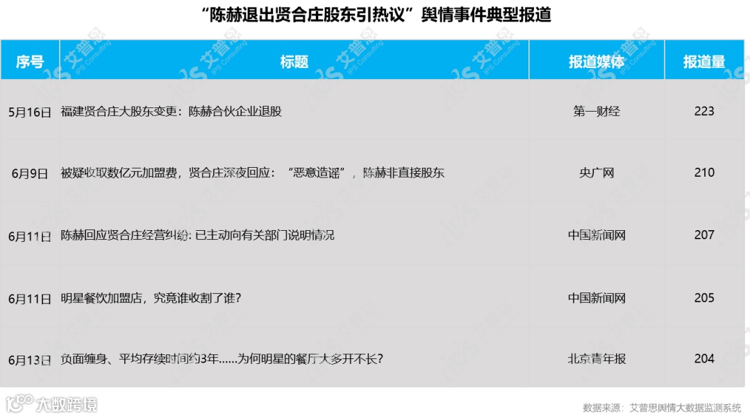 关于“陈赫退出贤合庄股东引热议”舆情事件的典型报道包括《福建贤合庄大股东变更:陈赫合伙企业退股》《被疑收取数亿元加盟费,贤合庄深夜回应:“恶意造谣”,陈赫非直接股东》《陈赫回应贤合庄经营纠纷: 已主动向有关部门说明情况》等,报道量排名前五的信息为: