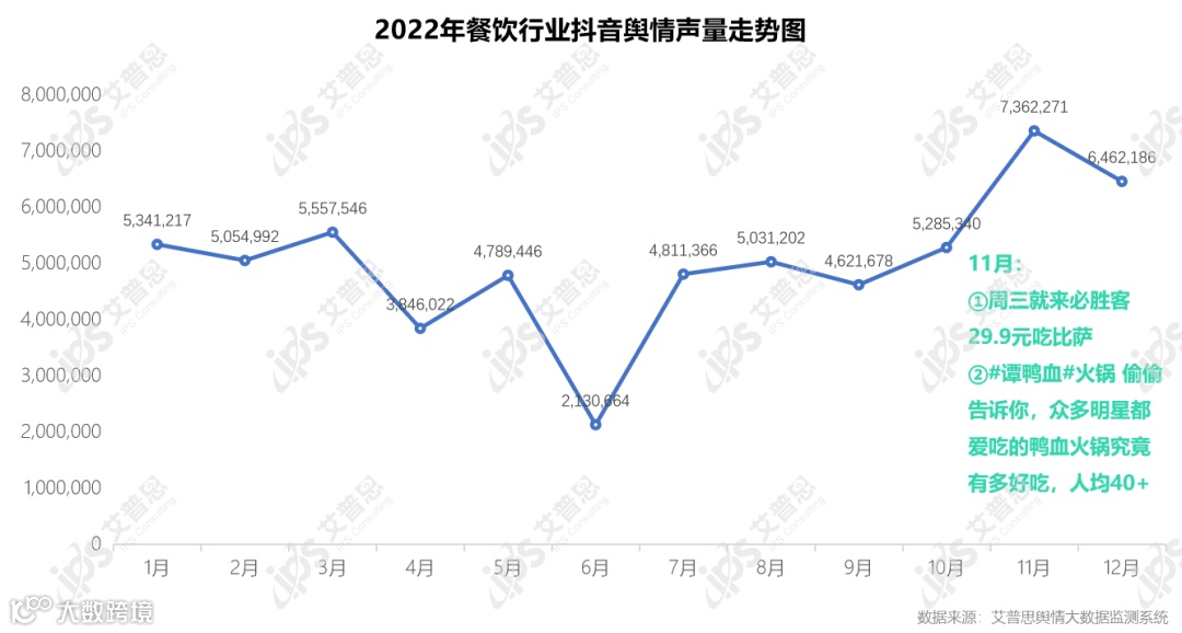 2022年,抖音平台涉及餐饮行业的舆情声量为60,293,930篇次,月均声量为5,024,494篇次。