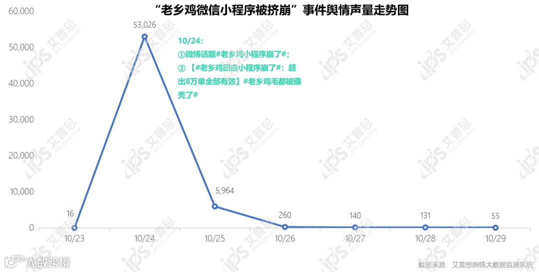 艾普思舆情大数据监测系统显示,“老乡鸡微信小程序被挤崩”事件舆情声量为59,592篇次,声量峰值出现在10月24日(单日声量53,026篇次),随后舆情热度逐渐平息。