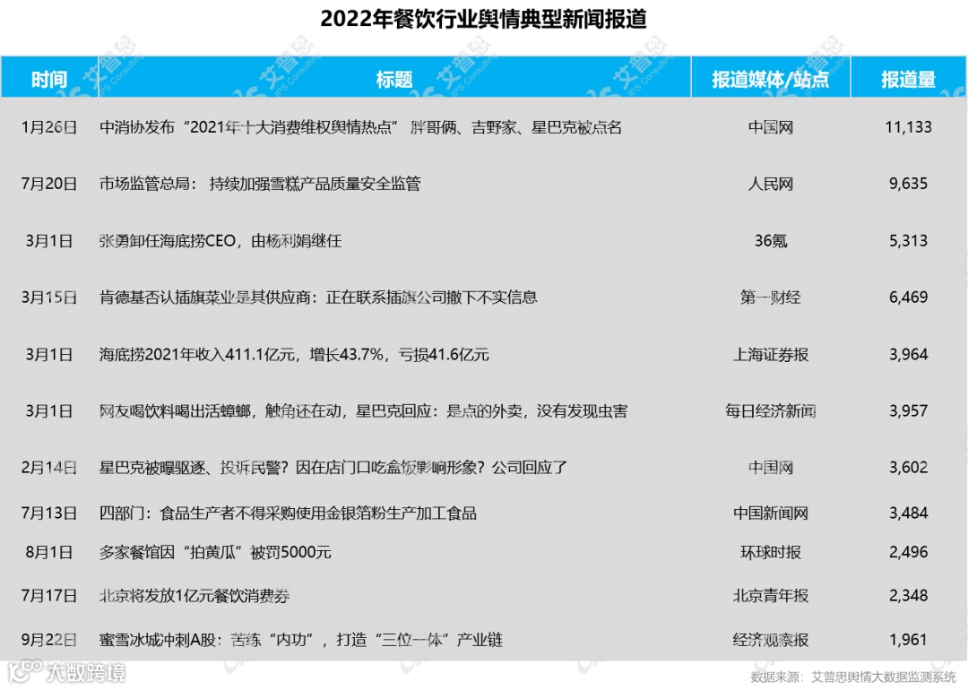 2022年,餐饮行业舆情典型报道有《中消协发布“2021年十大消费维权舆情热点” 胖哥俩、吉野家、星巴克被点名》、《市场监管总局:持续加强雪糕产品质量安全监管》、《张勇卸任海底捞CEO,由杨利娟继任》等,报道量排名前十的信息为: