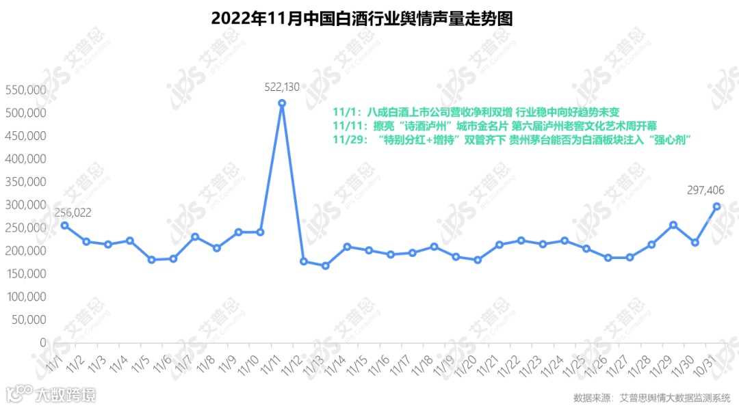 艾普思舆情大数据监测系统显示,11月,涉及白酒行业的舆情声量为6,590,364篇次,较上月大幅上涨(10月舆情声量5,694,677篇次),日均声量达219,679 篇次。其中,声量极值出现在11月11日(单日声量522,130篇次)。声量高点主要受《八成白酒上市公司营收净利双增 行业稳中向好趋势未变》《擦亮“诗酒泸州”城市金名片 第六届泸州老窖文化艺术周开幕》《“特别分红+增持”双管齐下 贵州茅台能否为白酒板块注入“强心剂”》等信息影响。