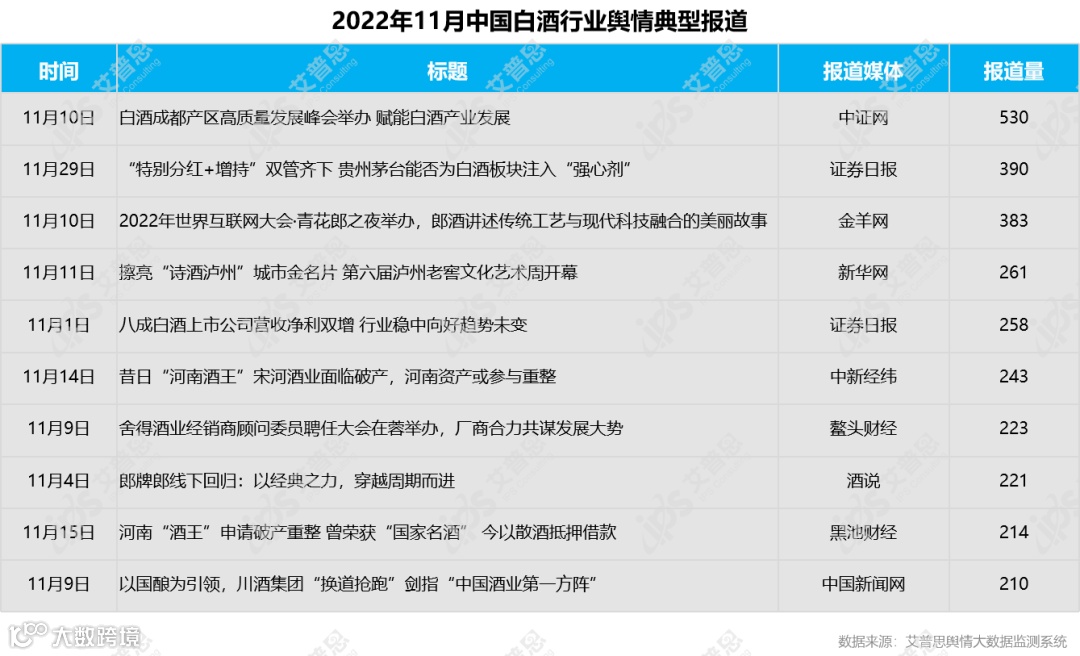 11月,白酒行业舆情典型报道有《白酒成都产区高质量发展峰会举办 赋能白酒产业发展》《2022年世界互联网大会·青花郎之夜举办,郎酒讲述传统工艺与现代科技融合的美丽故事》《擦亮“诗酒泸州”城市金名片 第六届泸州老窖文化艺术周开幕》等,报道量排名前十的信息为: