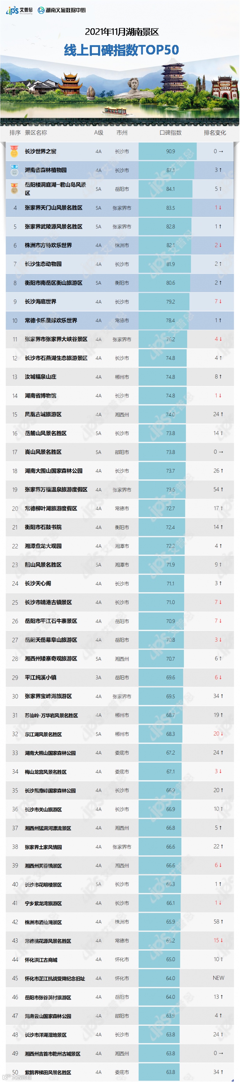 排名前50的景区中,4A景区39个,5A景区10个, 3A景区1个;归属长沙市的景区15个,张家界市6个,岳阳市、湘西土家族苗族自治州各5个,郴州市、常德市、娄底市各3个,湘潭市、怀化市、衡阳市、株洲市、邵阳市各2个。