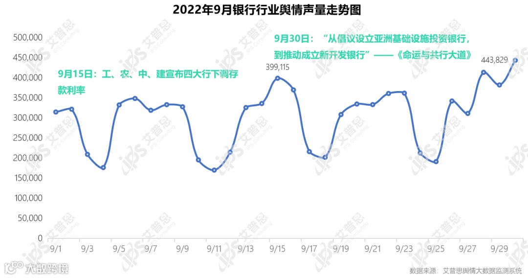 艾普思舆情大数据监测系统显示,9月,涉及银行业的舆情声量为9,114,955篇次,环比下降约11%(8月舆情声量为10,300,048篇次),日均声量为303,832篇次。声量极值出现在9月30日(单日声量443,829篇次),主要受新华社报道《命运与共行大道》影响。