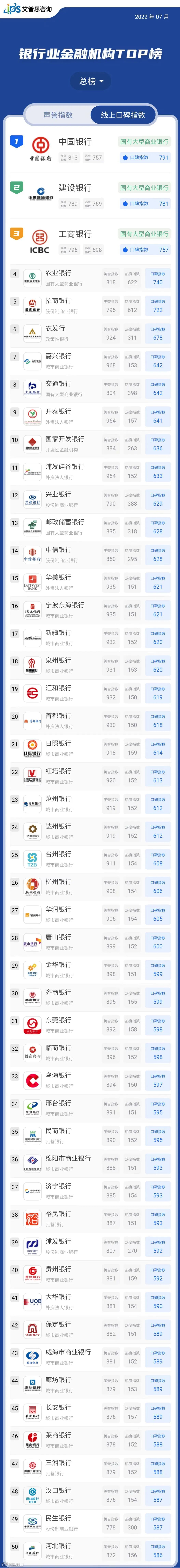 线上口碑指数排名前50的银行业金融机构中,包括城市商业银行29家、国有大型商业银行6家、股份制银行5家、外资法人银行5家、民营银行3家、政策性银行1家、开发性金融机构1家。