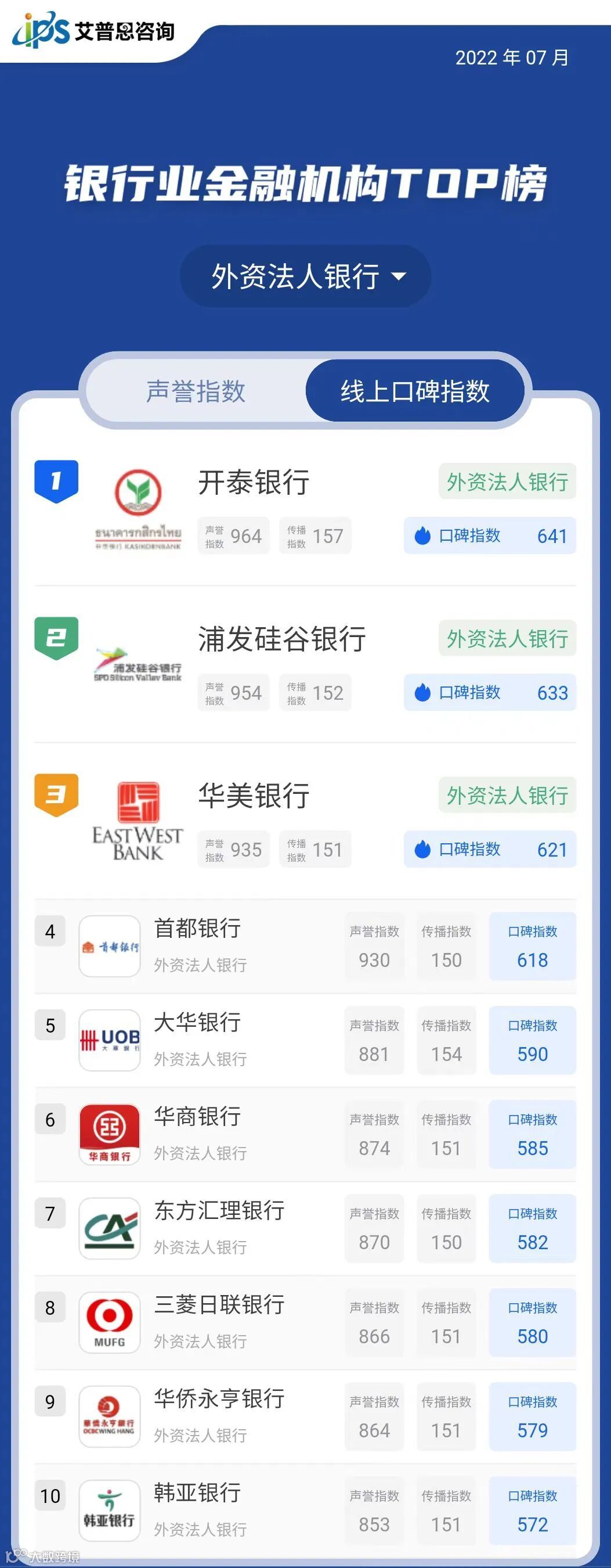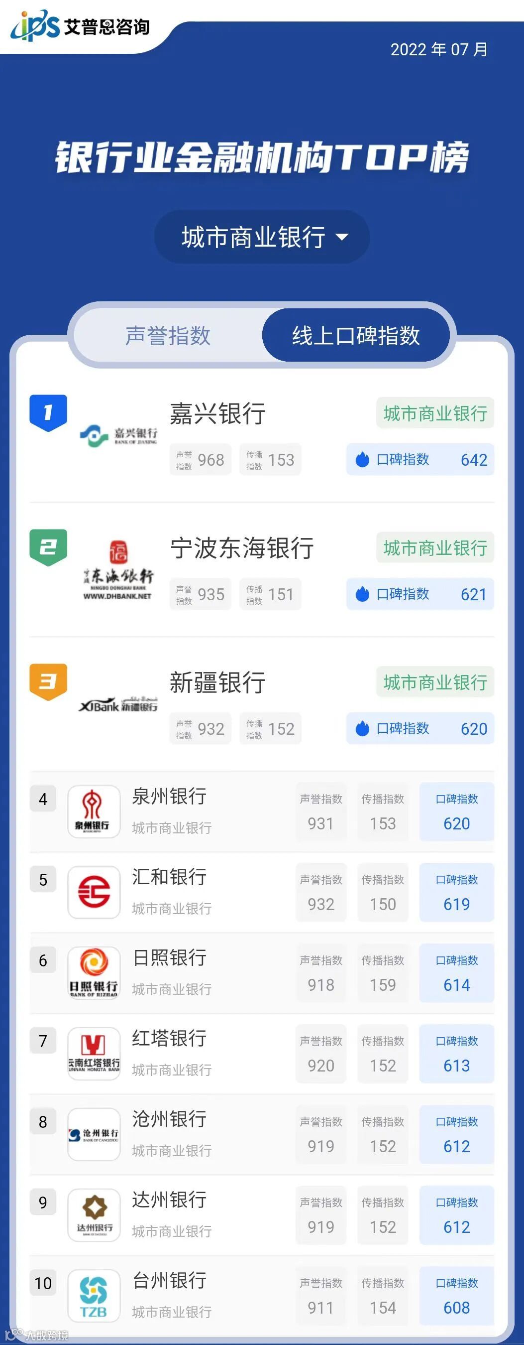 2022年7月线上口碑指数排名前三的银行业金融机构为:中国银行(国有大型商业银行,口碑指数791)、建设银行(国有大型商业银行,口碑指数781)、工商银行(国有大型商业银行,口碑指数757)。