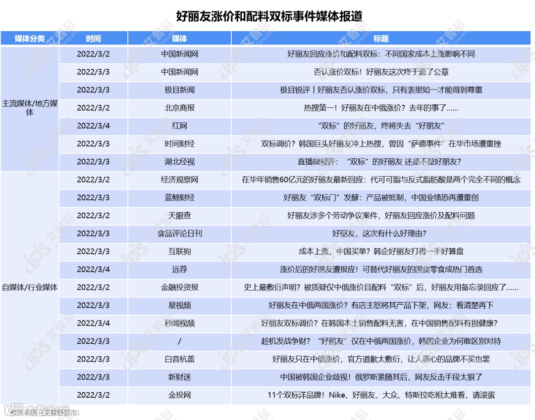 3月1日,部分网民在微博、抖音等社交平台爆料:韩国品牌好丽友以原材料涨价为由,对中俄两国部分产品进行价格上调,同时有网友在查看国内外的好丽友产品配料表后发现,配料有所不同(国内配料显示为代可可脂,而韩国材料为可可粉),被网民认为是“双标”行为。