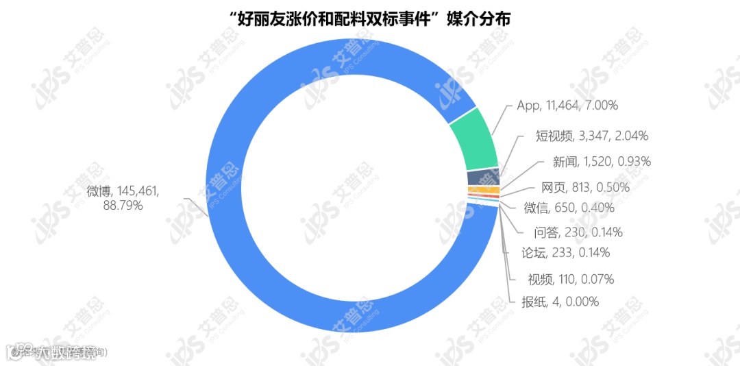 “好丽友涨价和配料双标” 事件相关信息量共计163,832条,声量主要集中在微博平台;微博声量由微博大V、媒体用户发文及普通用户讨论带动,多达145,461条,占总声量的88.79%;其次是APP平台,声量达11,464条,占总声量的7%;短视频、新闻、网页、微信等平台声量共计6,907条,占比4.21%。