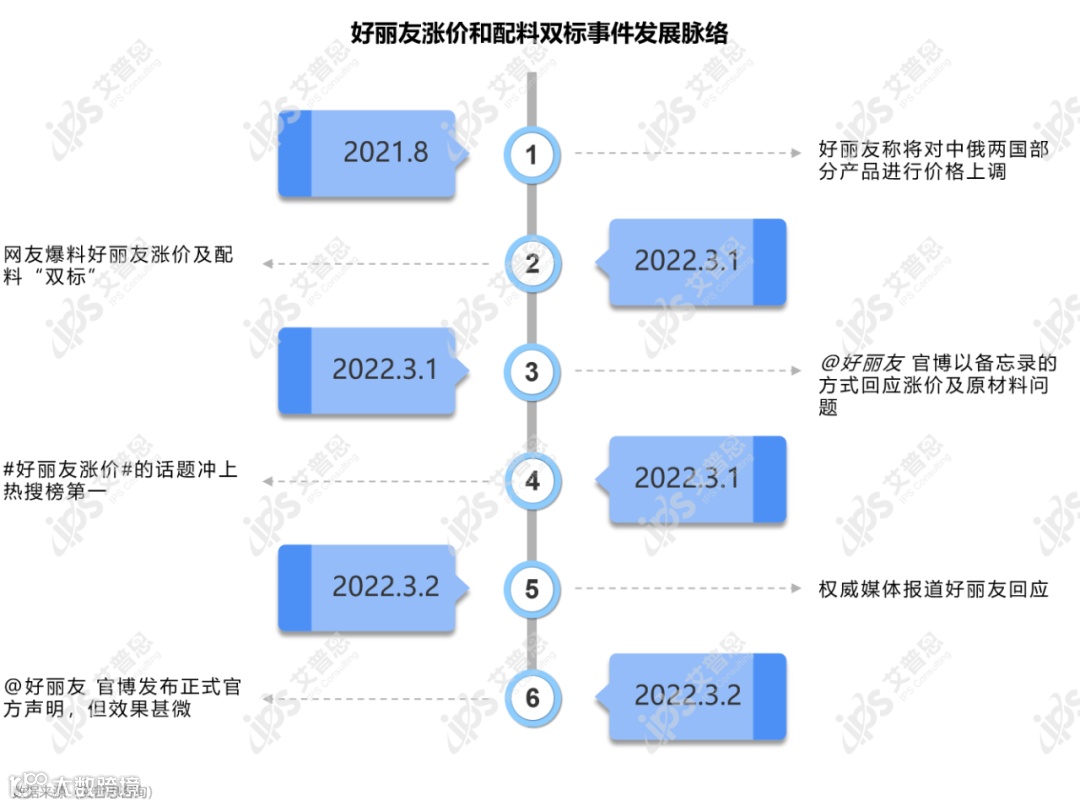 2021年8月,韩国好丽友总部发布声明称,由于原材料成本上升,好丽友将对中俄两国部分产品进行价格上调,但本土价格保持不变。2022年3月1日,“好丽友涨价”事件被国内网友爆料,同时曝光的还有同类产品国内外配料不一。当晚,#好丽友涨价#微博话题登上热搜第一,好丽友官博以备忘录的方式否认了涨价,但在证据确凿的情况下,其敷衍以及矢口否认的态度激起了国内消费者的强烈抵制,更让后续的正式官方声明效果大打折扣。