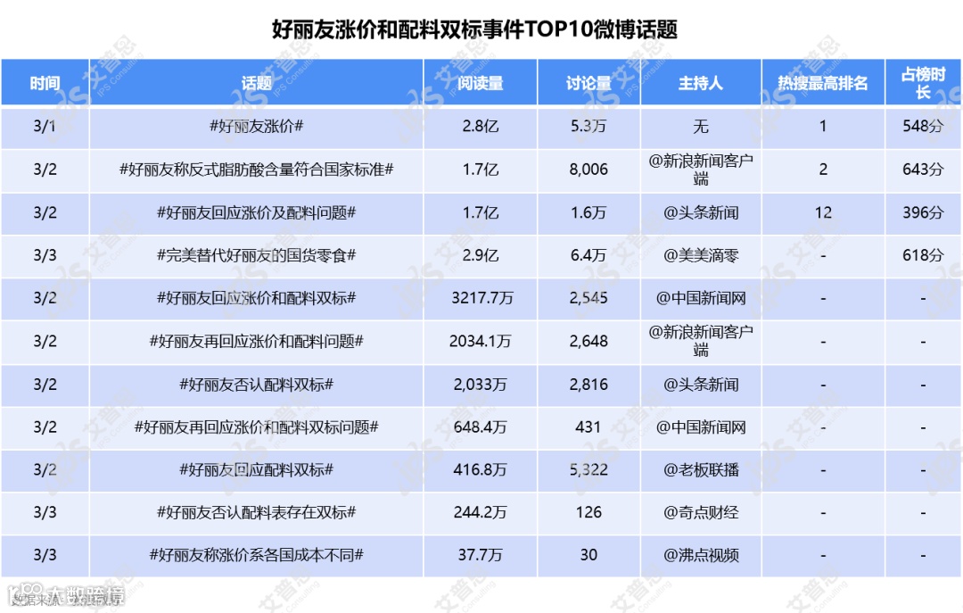 好丽友涨价和配料“双标”事件TOP10微博话题