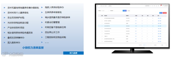 以建设各个业务场景带动服务创新,包括民生资金的管理及发放、集体“三资”的管理及使用、村级小微权力清单梳理与公开、村级事务公开公示等。通过各类业务场景的大数据监督模型构建以及信息公开公示,加强对民生资金、集体“三资”、村务卡监督、民生工程等领域监督力度。
