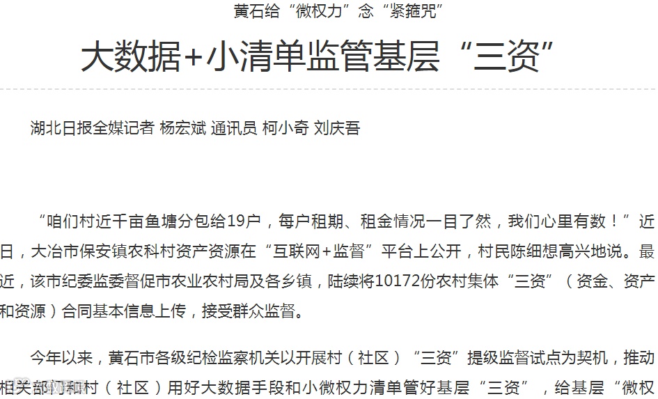 “咱们村近千亩鱼塘分包给19户,每户租期、租金情况一目了然,我们心里有数!”近日,大冶市保安镇农科村资产资源在“互联网+监督”平台上公开,村民陈细想高兴地说。最近,该市纪委监委督促市农业农村局及各乡镇,陆续将10172份农村集体“三资”(资金、资产和资源)合同基本信息上传,接受群众监督。