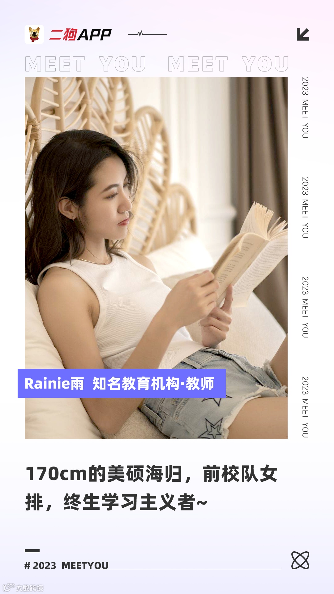 Hello~我是 Rainie,来自广州,会粤语,曾留美4.5年,为人真诚、善良、坦率、乐观、爱笑,偶尔有点小调皮~