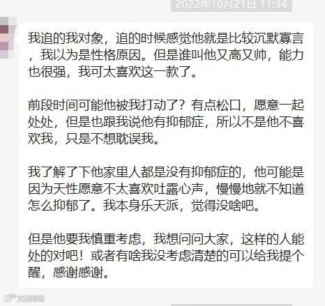 今日话题:投稿人的追求的对方,男方又高又帅能力强,但是有抑郁症,这样的情况在一起可以么?