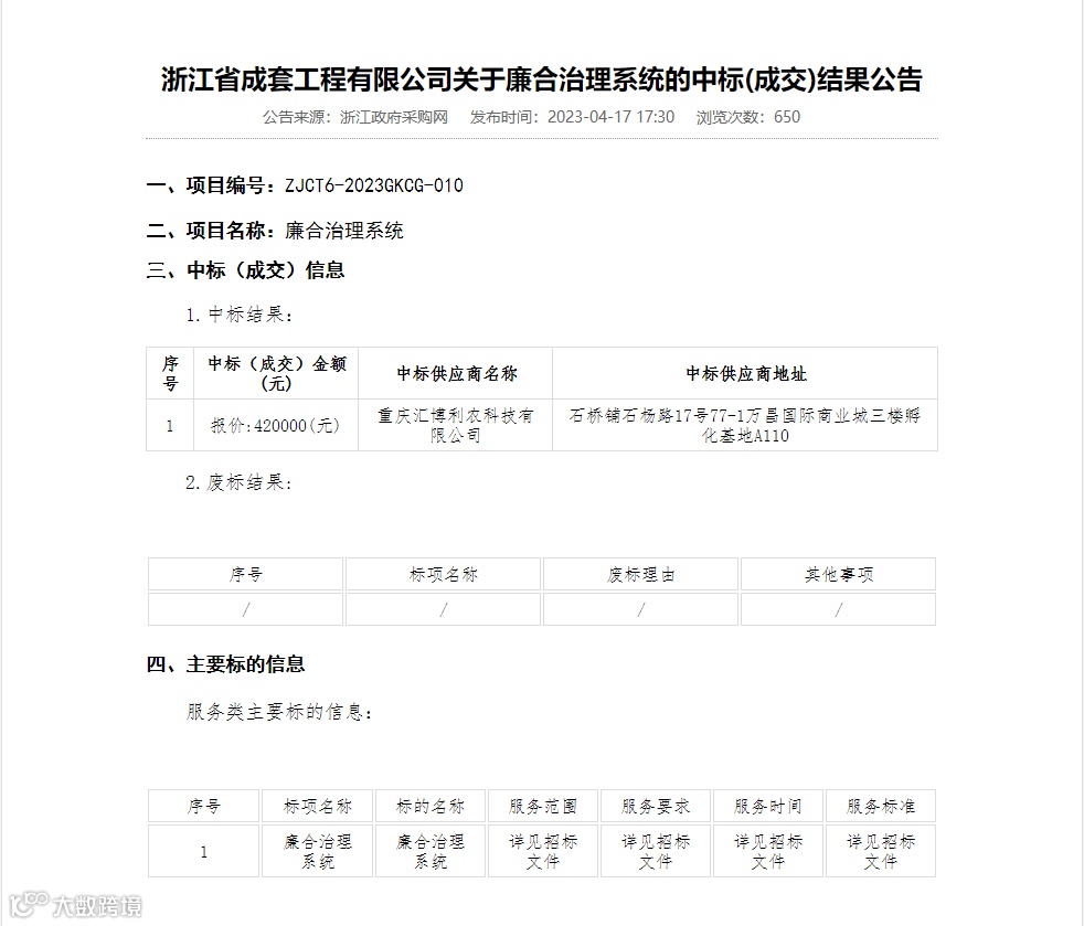 该项目位于浙江省杭州市,项目合作内容是建设廉合治理系统。主要内容:建立行贿人信息库,形成具备通知通报、信息共享、联合惩处等功能的数字化管理系统。