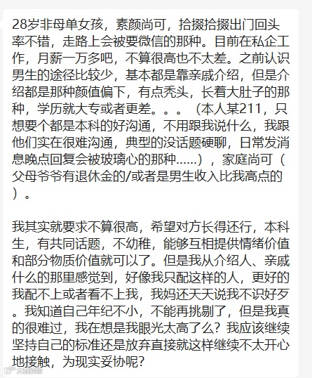 今日话题:投稿人28岁,打扮后颜值中上,路上会被要微信的那种。目前在私企工作,月薪一万多,认识男生的途径比较少,基本靠亲戚介绍,但是介绍都是那种颜值偏下,有点秃头,长着大肚子的那种,学历就大专或者更差,家庭\收入尚可的男士。 发帖人认为自己就要求不算很高,但是从介绍人那里感觉到,好像自己只配这样的人,更好的配不上或者别人看不上,她知道自己年纪不小,不能再挑剔了,但还是疑惑应该继续坚持自己的标准,还是放弃躺平为现实妥协呢?