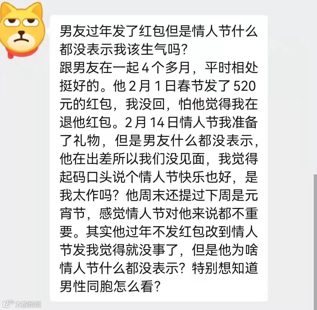 用户投稿:男友过年发了红包但是情人节什么都没表示,我应该生气吗,想知道大家怎么看?