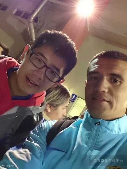 照片是和澳洲足球传奇前锋蒂姆卡希尔的合影。
